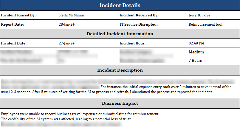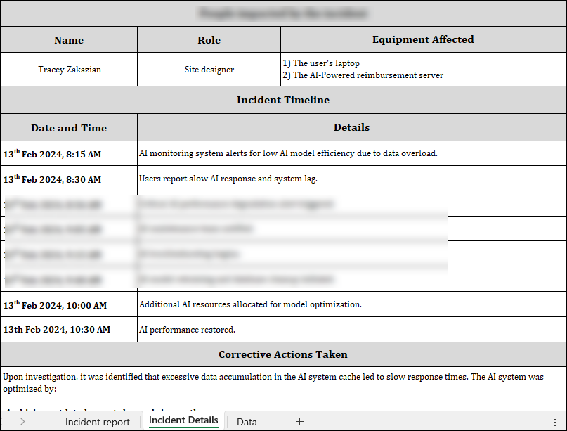- Incident Description: Clearly outline the details of the AI incident, including what happened, when it occurred, and the impact it had.